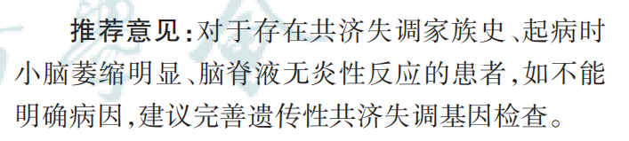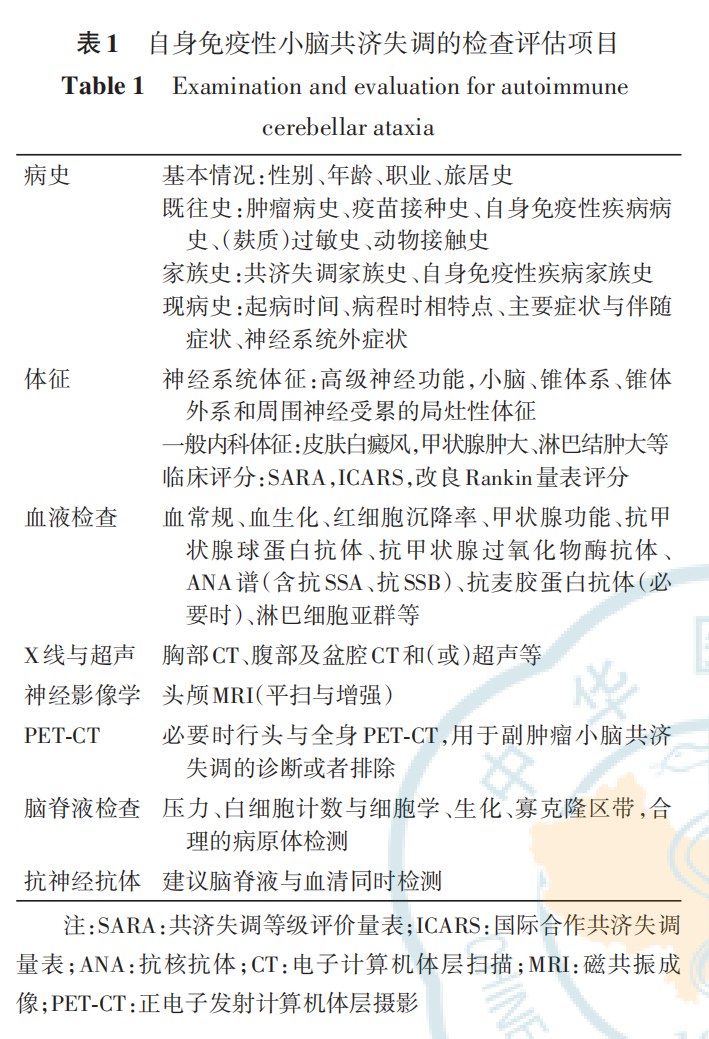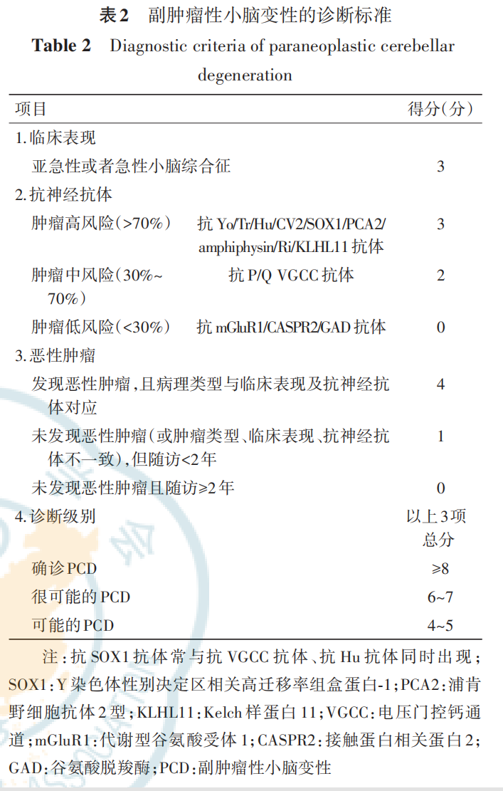 ♦ 后遗症期的特殊表现 小脑明显萎缩:伴随脑桥“十字面包征”,这是一种特征性的神经影像学表现(图 2C~F)。 ♦ 全身PET-CT的应用 系统性肿瘤的发现:全身PET-CT对于检测潜在的系统性肿瘤非常有帮助,尤其是在副肿瘤性小脑共济失调的诊断中。 ![]() No.3 系统性检查 抗甲状腺抗体、甲状腺功能、干燥综合征相关检查有助于发现并存的其他自身免疫性疾病;对GA 患者可完善消化吸收功能及内镜检查,小肠绒毛萎缩、隐窝增生、上皮内淋巴细胞或浆细胞浸润支持乳糜泻诊断;在合并典型PNS表现或肿瘤高风险的抗神经抗体阳性患者中,应完善肿瘤筛查。 ![]() No.4 基因检测 遗传性疾病是导致小脑共济失调的重要原因,特别是在具有家族史或起病时小脑萎缩明显的患者中。 ♦ 基因检查的适用情况 对于以下情况的小脑共济失调病例,进行遗传性小脑共济失调的基因检查是必要的: 1.难以确诊的病例;2.有共济失调家族史的患者;3.起病时小脑萎缩明显的患者。 ♦ 遗传性共济失调的复杂性 由于遗传性共济失调的疾病种类繁多,遗传方式多样,因此需要根据患者的具体情况制定基因检测的流程。 ♦ 推荐的基因检测方法包括: 全外显子组测序:可以检测患者所有编码蛋白质的基因区域。 动态突变检测:用于识别那些拷贝数会变化的遗传变异。 ♦ 确定基因检测流程的依据 在制定基因检测流程时,应考虑患者的临床特点、患者的家族史、人群流行病学数据。 ![]() No.5 检查评估项目 ACA的诊断需要综合患者的临床表现、脑脊液 检查、神经影像学和遗传学等结果,进行合理的鉴 别诊断,才能确诊。 ![]() 诊断与鉴别诊断 ![]() ![]() No.1 PCD的诊断标准 ♦ PCD诊断的三个要素 确诊PCD必须同时满足以下三个要素: ① 小脑综合征**:患者表现出小脑功能障碍的临床症状。 ② 抗神经抗体阳性**:血液或脑脊液中检测到针对神经元的特定抗体。 ③ 恶性肿瘤**:存在恶性肿瘤,并且其类型与临床表现及抗神经抗体相符合。 ♦ PCD诊断的三个级别 根据2021年PNS诊断标准,PCD的诊断水平分为三个级别: 级别一:确诊的PCD:满足所有诊断要素。 级别二:很可能的PCD:几乎满足所有诊断要素,但可能缺乏部分证据。 级别三:可能的PCD:部分满足诊断要素,需要进一步的证据支持。 ♦ PCD相关抗体与恶性肿瘤 PCD的诊断还涉及到特定抗体与相关恶性肿瘤的关联,例如: 抗Yo抗体:与乳腺癌或卵巢癌相关。 抗Tr抗体:与霍奇金淋巴瘤相关。 抗KLHL11抗体:与生殖细胞瘤相关。 抗SOX1抗体:与小细胞肺癌相关。 抗PCA2抗体:与肺癌或乳腺癌相关。 抗Ri抗体:与乳腺癌或肺癌相关。 ♦ 肿瘤筛查的重要性 对于肿瘤高风险抗体阳性的患者,即使初次肿瘤筛查结果为阴性,也应在随诊中继续定期进行肿瘤筛查。 2021年PNS诊断标准的“确诊标准”相较于2004年的标准敏感度较低,但“很可能的诊断标准”在某些情况下可以达到2004年的确诊标准。因此,在临床工作中,对于“很可能的PCD”患者也应给予积极的诊断和治疗。 ![]() No.2 抗GAD小脑共济失调的诊断标准 专家组参考 Graus 等 关于抗 GAD 抗体相关 神经免疫病的诊断建议,制订了抗 GAD 小脑共济 失调诊断标准,并予以推荐。 ![]() No.3 PACA的诊断标准 根据前期中国PACA队列研究提出的PACA诊断标准,共识专家组对 2020 年国际工作组PACA 标准进行了调整修订,并予以推荐。 确诊PACA需要同时符合诊断标准中的4项条件。 ![]() PACA 诊断相关抗体包括系统性自身免疫病相关抗体和小脑神经元相关抗体。 ![]() ♦ PACA的诊断涉及两大类抗体: 系统性自身免疫病相关抗体:这些抗体与系统性自身免疫病有关,可能在PACA患者中被检测到。 小脑神经元相关抗体:这些抗体的靶蛋白通常参与小脑神经元的胞吞/胞吐过程或mGluR1介导的胞内信号通路。胞吞/胞吐过程相关蛋白: 抗Ca/ARHGAP26抗体、 抗TRIM9/67抗体;mGluR1介导的胞内信号通路相关蛋白:抗Sj/ITPR-1抗体、抗Homer-3抗体、抗PKCγ抗体。 ♦ 抗体阳性的诊断意义 ♦ 在PACA的诊断标准中,抗体阳性被视为可选的诊断条件,而不是必须满足的条件。 No.4 对于在中国人群中相对罕见的病种,如抗 mGluR1小脑共济失调、自身免疫性脑炎相关 小脑共济失调以及GA,由于缺乏公认的诊断 标准,诊断要点通常基于专家经验和文献 报道来提出 ♦ 抗mGluR1小脑共济失调的诊断要点 ①急性或者亚急性小脑共济失调,可合并脑病表现。 ②脑脊液可有淋巴细胞轻度升高或者特异性寡克隆区带阳性。 ③血清和(或)脑脊液抗mGluR1抗体阳性。 ④除外其他病因。 ♦ 自身免疫性脑炎相关小脑共济失调的诊断要点 ①小脑共济失调与脑炎症状相继或同时出现。 ②脑炎综合征与辅助检查结果符合自身免疫性脑炎的诊断标准(《中国自身免疫性脑炎诊治专 家共识(2022年版)》 ③除外其他病因。 ♦ GA的诊断要点 ①隐匿起病的小脑共济失调,可合并感觉运动性周围神经病、肌阵挛等。 ②可伴有乳糜泻、疱疹样皮炎等其他谷蛋白超敏表现,肠黏膜活组织检查可有小肠绒毛萎缩、隐窝增生、炎细胞浸润等改变。 ③血清抗麦胶蛋白抗体阳性。 ④除外其他病因。 ![]() ACA的诊断需要根据患者临床表现、血液及脑脊液检查、神经影像学与抗神经抗体检查等结果综合分析,同时进行合理的鉴别诊断,以除外感染性小脑炎、前庭神经炎、酒精及药物性、遗传性、退行性及肿瘤等其他病因。 ACA的神经功能评估 ![]() ![]()