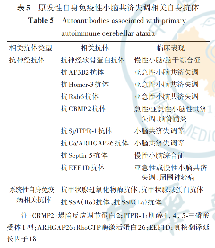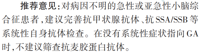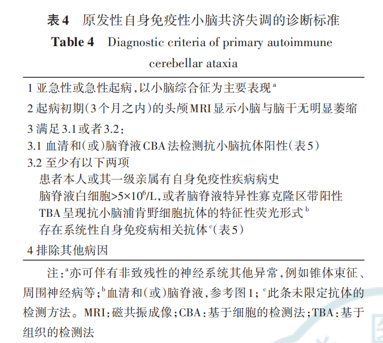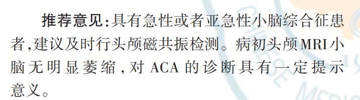 最新标准!自身免疫性小脑共济失调诊断标准更新自身免疫性小脑共济失调,是一组由自身免疫机制引起的小脑综合征,包括副肿瘤性小脑共济失调和抗谷氨酸脱羧酶小脑共济失调等。根据是否由肿瘤诱发,ACA可分为副肿瘤性ACA和非副肿瘤性ACA。副肿瘤性ACA又称副肿瘤性小脑变性(PCD)。非副肿瘤性 ACA 一般包括抗谷氨酸脱羧酶(GAD)小脑共济失调 、原发性自身免疫性小脑共济失调(PACA)与谷蛋白共济失调( GA)等病因。这类疾病约占成人小脑共济失调病因的20%,是散发性小脑共济失调中重要且可治疗的病因。 新共识提出了一系列基于临床表现、脑脊液学、神经影像学、抗神经抗体与相关共病等综合诊断要素的ACA诊断标准。这些标准的制定,将使ACA的诊断更加精准和规范,为患者提供更有效的治疗方案。 ![]() 自身免疫性小脑共济失调(ACA)是一种由免疫系统错误攻击自身小脑组织引起的疾病。最新研究揭示了ACA与恶性肿瘤、前驱感染、麸质过敏等诱因之间的关联。特别是副肿瘤性小脑变性(PCD),它是由细胞免疫介导的,其相关自身抗体的靶抗原通常位于神经元内部,尽管抗体本身致病性不明显,但它们的存在是疾病诊断的关键线索。 致病性抗体:ACA的“直接参与者” 某些抗小脑抗体直接参与疾病的发生,被称为致病性抗体。例如,抗代谢型谷氨酸受体1(mGluR1)抗体和抗谷氨酸脱羧酶(GAD)抗体。这些抗体通过与特定受体结合,干扰神经元功能,导致小脑功能障碍。 抗GAD抗体:干扰GAD活性,影响γ-氨基丁酸(GABA)能神经元通路,导致小脑功能受损。抗mGluR1抗体:与神经元表面的mGluR1结合,减少其数量,影响小脑功能。 ACA的病因分类 ![]() ![]() 不同病因的 ACA 在临床特征和预后等方面有所不同。ACA 多呈亚急性起病,也有急性起病者,个别病例隐匿起病。小脑共济失调是 ACA的核心症状,以步态共济失调最常见,其次为肢体共济失调、头晕(或眩晕)、构音障碍、眼震等。ACA也可合并小脑以外的神经系统损害以及神经系统以外的系统性自身免疫病。ACA 的主要病因分类包括以下6种: No.1 副肿瘤性小脑共济失调:PNS的常见面貌 副肿瘤性小脑共济失调是副肿瘤神经综合征(PNS)的一种表现形式,它通过肿瘤诱发的异常免疫反应,对神经系统造成远隔影响。这种病症的存在,往往在肿瘤被发现之前就已显现出端倪。 ♦ 抗Yo抗体:小脑共济失调的常见抗体 在副肿瘤性小脑共济失调中,抗Yo抗体扮演着核心角色。它主要针对小脑变性相关蛋白2样蛋白(CDR2L),与乳腺癌或女性生殖系统肿瘤有较高的关联度。患者通常表现为单纯的小脑综合征,且症状在肿瘤确诊前就已出现。 ♦ 多样的PCD相关抗体 除了抗Yo抗体,副肿瘤性小脑变性(PCD)还与其他多种抗体有关,如抗Hu、抗Tr、抗Ri、抗KLHL11和抗两性蛋白(amphiphysin)抗体。 ♦ 临床表现:从亚急性发病到多样症状 副肿瘤性小脑共济失调的临床表现多样,通常以亚急性方式发病,并可能在短短3个月内迅速进展至重度失能。在抗Yo和抗Tr抗体阳性的患者中,小脑症状占主导地位。然而,与其他抗体相关的PCD患者可能展现更广泛的症状,包括脑干脑炎、周围神经病或眼阵挛-肌阵挛综合征等。 No.2 抗GAD小脑共济失调:中老年女性的 隐匿挑战 抗谷氨酸脱羧酶(GAD)小脑共济失调是一种主要影响中老年女性的神经系统疾病,其起病方式多样,可能亚急性或隐匿,给诊断带来挑战。 ♦ 抗GAD小脑共济失调:中老年女性的专属挑战 这种疾病多见于50至60岁的女性,其起病可能亚急性或隐匿,给早期诊断带来难度。 ♦ 神经系统合并症:多样且复杂 患者可能合并多种神经系统疾病,如边缘叶脑炎、僵人综合征等,这些增加了疾病的复杂性。 ♦ 自身免疫病的共存 抗GAD小脑共济失调患者也可能伴有其他器官特异性自身免疫病,包括1型糖尿病、白癜风、桥本甲状腺炎等,这提示了疾病之间可能存在的免疫学联系。 ♦ 影像学特征:小脑萎缩的线索 对于隐匿起病的患者,颅脑磁共振成像(MRI)可能揭示小脑萎缩的迹象,为诊断提供线索。 ♦ 肿瘤合并症:少数患者的双重打击 尽管大多数患者不伴有肿瘤,但仍有少数患者可能合并小细胞肺癌或胸腺瘤等肿瘤。 No.3 抗mGluR1小脑共济失调: 当学习与记忆的守护者受攻击 抗代谢型谷氨酸受体1(mGluR1)小脑共济失调是一种由特定抗体攻击引起的神经系统疾病,对患者的运动学习和认知功能构成威胁。 ♦ mGluR1:小脑功能的关键角色 mGluR1受体在小脑浦肯野细胞的树突以及小脑的平行纤维和攀缘纤维中表达,对小脑的运动协调和学习过程起着至关重要的作用。 ♦ 抗mGluR1抗体:致病性抗体的发现 抗mGluR1抗体是已知的致病性抗体之一,能够减少培养神经元上的mGluR1分子数量,影响小脑功能。在动物模型中,这种抗体的致病性已得到证实。 ♦ 中老年患者的挑战 抗mGluR1抗体阳性的患者多为中老年人,他们可能会经历情绪性格的改变、精神行为异常以及认知功能的下降。这些小脑外症状对患者的日常生活构成了重大影响。 ♦ 非副肿瘤性与肿瘤合并症 大多数抗mGluR1小脑共济失调患者表现为非副肿瘤性,但少数患者可能合并淋巴瘤等恶性肿瘤。 ♦ 急性期的诊断线索 在疾病的急性期,头颅MRI可能显示小脑异常信号,并伴有脑膜强化,为诊断提供重要线索。 ♦ 脑脊液检查的辅助作用 通过腰椎穿刺获取的脑脊液检查可能显示淋巴细胞的轻度升高或特异性寡克隆区带阳性,这些