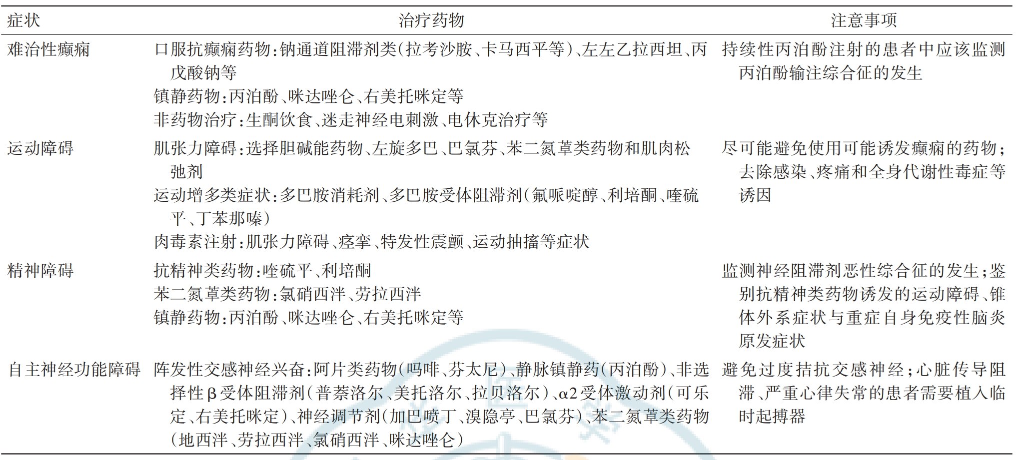 重症自身免疫性脑炎的症状管理及免疫治疗![]() 自身免疫性脑炎(AE)是一种自身免疫机制介导的脑炎,由于早期临床症状多样且复杂给疾病管理带来了巨大的挑战,部分AE患者最终发展成重症自身免疫性脑炎(SAE)。临床医师如何早期识别SAE并及时开展免疫治疗是决定预后的关键。此篇综述中,作者张炳俊等人总结了当前研究证据和指南观点,全面探讨了SAE患者的症状管理、并发症管理及免疫治疗策略,以期为临床诊疗实践提供有效参考。 本次小编将摘录该综述中的主要内容,便于学习和临床应用。 SAE的诊断 国际上对于SAE尚无明确定义,当患者出现以下一种或多种症状时,应考虑将其收入重症监护室:意识水平下降、严重运动障碍、自主神经功能障碍、癫痫持续状态、需要机械通气或出现其他并发症(如严重脓毒症、器官衰竭、脑水肿等)。改良Rankin量表(mRS)和自身免疫性脑炎临床评估量表是评估AE症状严重程度的常用量表。大多数SAE患者的mRS评分为4~5分 SAE的症状管理及面临的挑战 01 )难治性癫痫 约有55%的SAE患者会出现癫痫持续状态,多数患者需要联合使用多种抗癫痫药物。钠通道阻滞剂,在单药与联合治疗中均有重要的地位,然而精准分型指导药物选择有待进一步探讨。 对于顽固性癫痫持续状态患者,中枢镇静药物(例如:丙泊酚)的应用是关键的治疗策略,但需要密切关注不良反应的发生。 对于药物难以控制的难治性癫痫,还可以考虑使用迷走神经电刺激或生酮饮食,迷走神经电刺激相关研究的样本量较小,其作用机制及临床可行性仍需进一步探索;生酮饮食在难治性癫痫中的治疗优势已在多个临床研究中得到证实,但其应用存在一定局限性,如患者的饮食依从性、潜在的代谢相关不良反应(如肾结石、脱水等)以及个体化差异等问题。 02 )运动障碍 在SAE患者中,约有60%出现运动障碍,表现为不自主运动、非特异性的舞蹈症、肌阵挛和刻板运动,也可能呈现出一些特征性症状,例如抗NMDAR脑炎的口面周活动、抗LGI1脑炎的面臂肌张力障碍等。 对于伴有意识障碍的患者,区分非痫性运动障碍和癫痫样发作非常重要,与治疗方向的选择相关。动态脑电监测是评估SAE患者运动障碍及癫痫活动的重要工具,但其也存在一定的局限性,例如对设备的依赖性、运动伪影的干扰以及对长期监测的患者配合度要求较高等。在实际临床应用中,需结合患者的具体情况,综合运用其他辅助检查手段,如影像学检查和实验室指标,共同指导临床决策。 目前针对AE相关运动障碍的特异性药物研究仍较为有限,临床治疗多依据药理学特性及类似运动障碍的治疗经验进行个体化用药选择。肉毒毒素注射在多种神经系统疾病中已被应用,包括肌张力障碍、痉挛、特发性震颤、运动抽搐等。 03 )精神症状 SAE相关的精神障碍常与抗精神类药物的不良反应如运动障碍、锥体外系症状以及神经阻滞剂恶性综合征(NMS)的症状重叠,若缺乏正确的判断,将影响SAE治疗的开展。 SAE相关的急性精神障碍单用抗精神类药物往往难以实现完全的控制,但可以减轻相关症状,降低并发症发生的概率。在重症监护室中,为了避免自伤、自杀及气道阻塞等情况,对于抗精神类药物无效的精神症状,可以使用丙泊酚、右美托咪定、咪达唑仑等镇静类药物。但同时需特别关注免疫治疗药物与镇静剂的药代动力学相互作用。 紧张症是一种精神和运动障碍,也是抗NMDAR脑炎常见的临床症状之一。主要临床表现包括不动、凝视、缄默和固定姿势,可能伴随谵妄、幻觉、精神运动性激越等精神症状。 紧张症的一线治疗方法包括苯二氮䓬类药物以及电休克,其中劳拉西泮是首选用药,金刚烷胺、溴隐亭、左旋多巴也可用于紧张症的缓解。癫痫持续状态、心律失常和自主神经功能紊乱是电休克的相对禁忌证,电休克在SAE并发的紧张症中应该谨慎开展。本领域仍需前瞻性研究明确不同亚型的精准治疗策略,特别是针对伴恶性综合征的重症患者,需建立基于生物标志物的个体化治疗方案。 04 )自主神经功能紊乱 在SAE患者中,约有55%出现自主神经功能紊乱,其特征性表现为体温、血压及心率调控异常。 阵发性交感神经兴奋(PSH)是一种以突发的交感神经兴奋性增加为特征的临床综合征,临床上可表现为血压升高、心动过速、呼吸急促、高热、大汗等,部分患者还可以表现为姿势、肌张力障碍,需与癫痫持续状态及紧张症鉴别。 目前PSH缺乏统一的治疗标准,但针对抗NMDAR脑炎患者的队列研究表明,未使用镇静药物者接受地西泮或苯巴比妥单药治疗的有效率达90%。对于重度自主神经功能衰竭伴恶性心律失常者,需行临时心脏起搏器植入以维持血流动力学稳定。 ![]() 表1.重症自身免疫性脑炎的症状管理 并发症管理 SAE并发的感染性休克、脓毒症、器官衰竭和颅内压升高等常导致不良预后,甚至死亡。 气道管理是SAE患者管理中的关键环节。及时建立人工气道可能有助于提高患者的舒适度并增强气道管理的安全性。 发热是SAE常见的并发症之一。感染、严重运动障碍、痉挛性抽搐、自主神经功能障碍继发的发热以及中枢性高热在SAE患者中也多见。区分感染性与非感染性发热可以避免抗生素的过度使用。 自主神经功能紊乱、长期使用抗生素和肠道菌群失调等因素可引发胃肠功能紊乱,SAE的肠道管理可以实施分层干预:短期使用药物改善便秘、控制渗